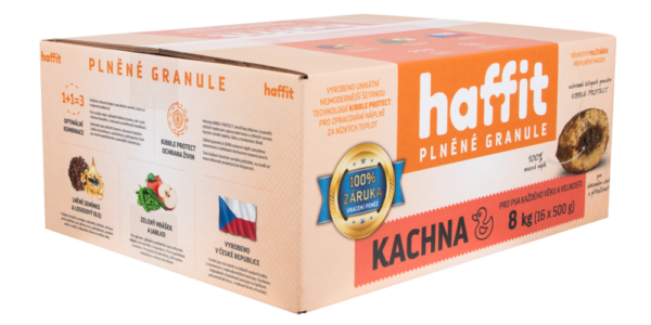 Pro plněné granule HAFFIT je typická chutnost a mimořádně vysoká využitelnost i kompletnost živin. Základem jsou vybrané kvalitní suroviny, převážně živočišné. Unikátní je zpracování technologií KIBBLE PROTECT do třívrstvého polštářku. Hlavní součást granule (66 %) je masová náplň zpracovaná za nižších teplot, aby se horkem nenarušila hodnota a využitelnost živin. Maso je ochráněno dobře propečenou křupavou vrstvou a opatřeno vrchní vrstvičkou s bylinkami. KIBBLE PROTECT – ochrana živin.